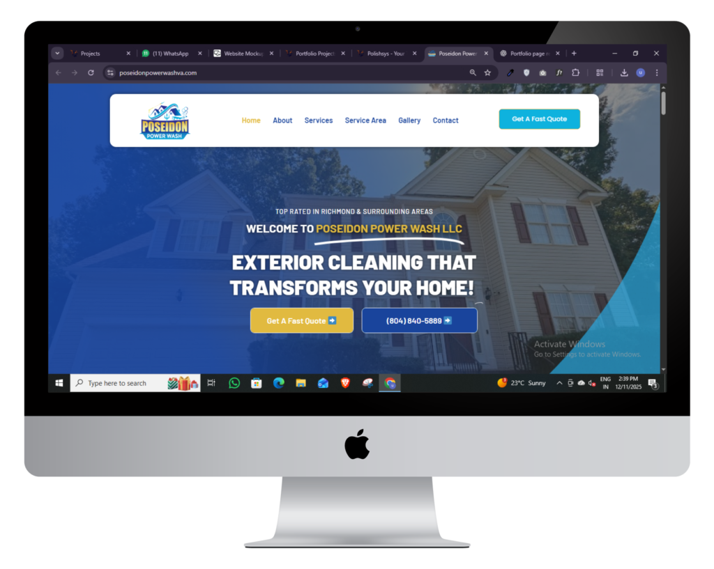 Polishsys redesigned and developed a professional, conversion-focused website for Poseidon Power Wash LLC, a highly rated exterior cleaning company serving Richmond and surrounding Virginia counties. The site highlights key services like exterior house washing, gutter cleaning, patio cleaning, and deck washing, while also making it easy for potential customers to get a fast quote. Poseidon Power Wash